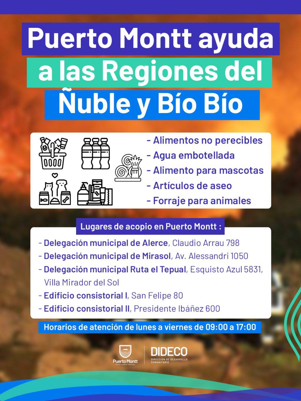 Ante la grave emergencia que afecta a las regiones de Ñuble y Biobío, producto de los devastadores incendios forestales, la Municipalidad de Puerto Montt anunció la implementación de una campaña oficial de recolección de ayuda, con el objetivo de apoyar a las familias que han perdido viviendas, enseres y medios de subsistencia.